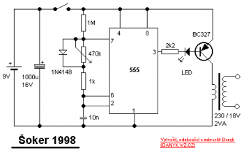 Okukal som schemu na https://www.danyk.wz.cz/soker.html a rozhodol som sa urobit si ho tiez, ani za ďabla som vsak nemohol nikde najst potenciometer M47 a preto som pouzil 1M ma to ale vyhodu v tom ze mozem menit frekvenciu vo vacsom rozsahu. nakreslil som plosak s fixou ako vzdy :D, osadil suciastkami zhora ako vzdy, potenciometer som upevnil na krabicku a do nej este vlozil dva seriovo spojene Li-ion baterky z mobilov, tranzistor som pouzil D560 ani neviem odkial je, a ani datasheet nemozem nikde najst. Samozrejme mozete pouzit aj iny tranzistor s max. prudom okolo 1A. Trafo ktore zvysuje napatie je obycajne 220/5-15V zapojene sekundarom do nasho obvodu.